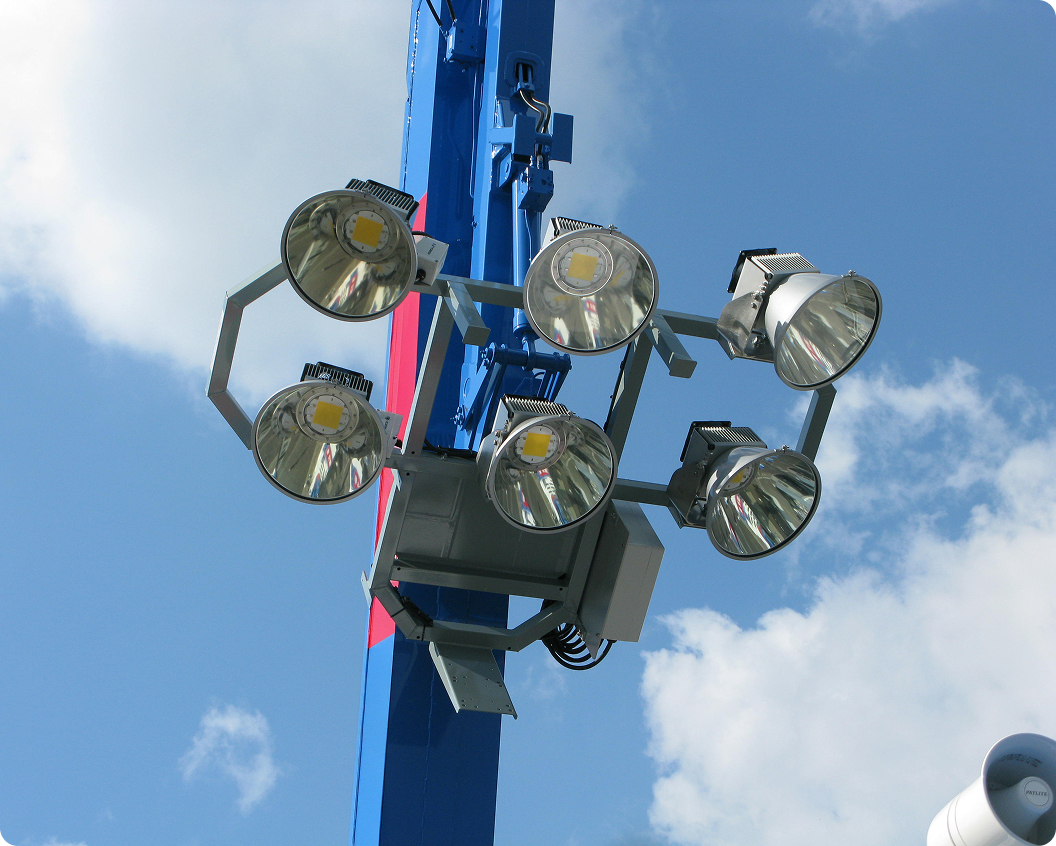 当社のLED照明「MIRACH-LED」は、大光量照明においても小型軽量化を実現、現在設置されている照明柱や架台はそのままで、LED照明への更新工事を行うことが可能です。