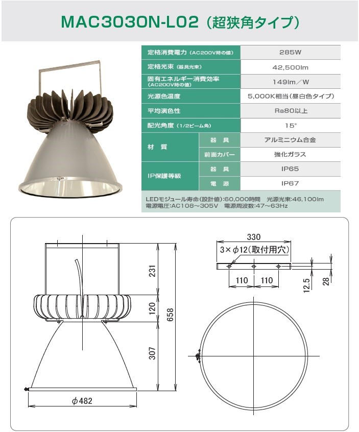 LEDモジュール寿命(設計値):60,000時間 / 光源光束:46,100lm